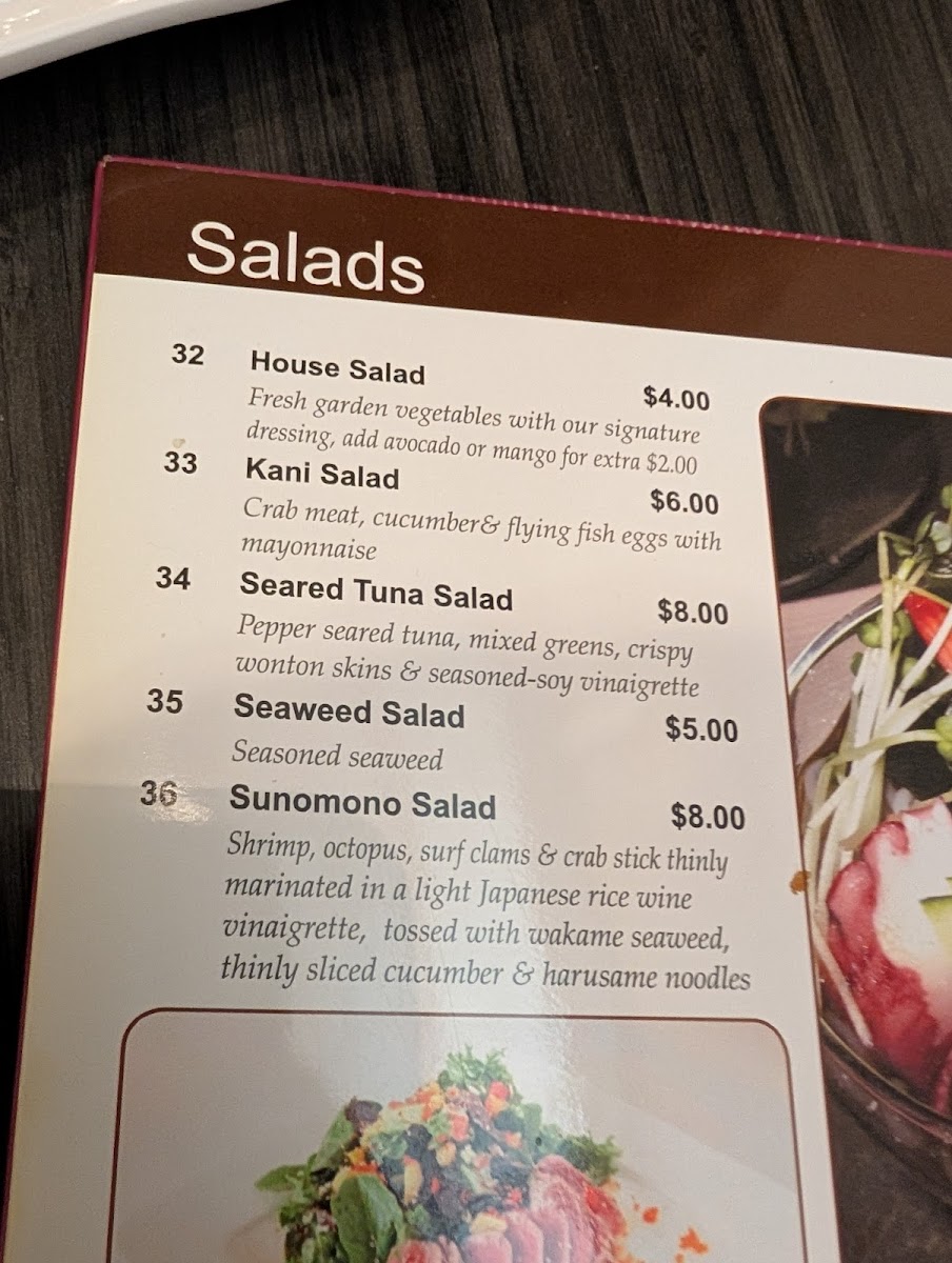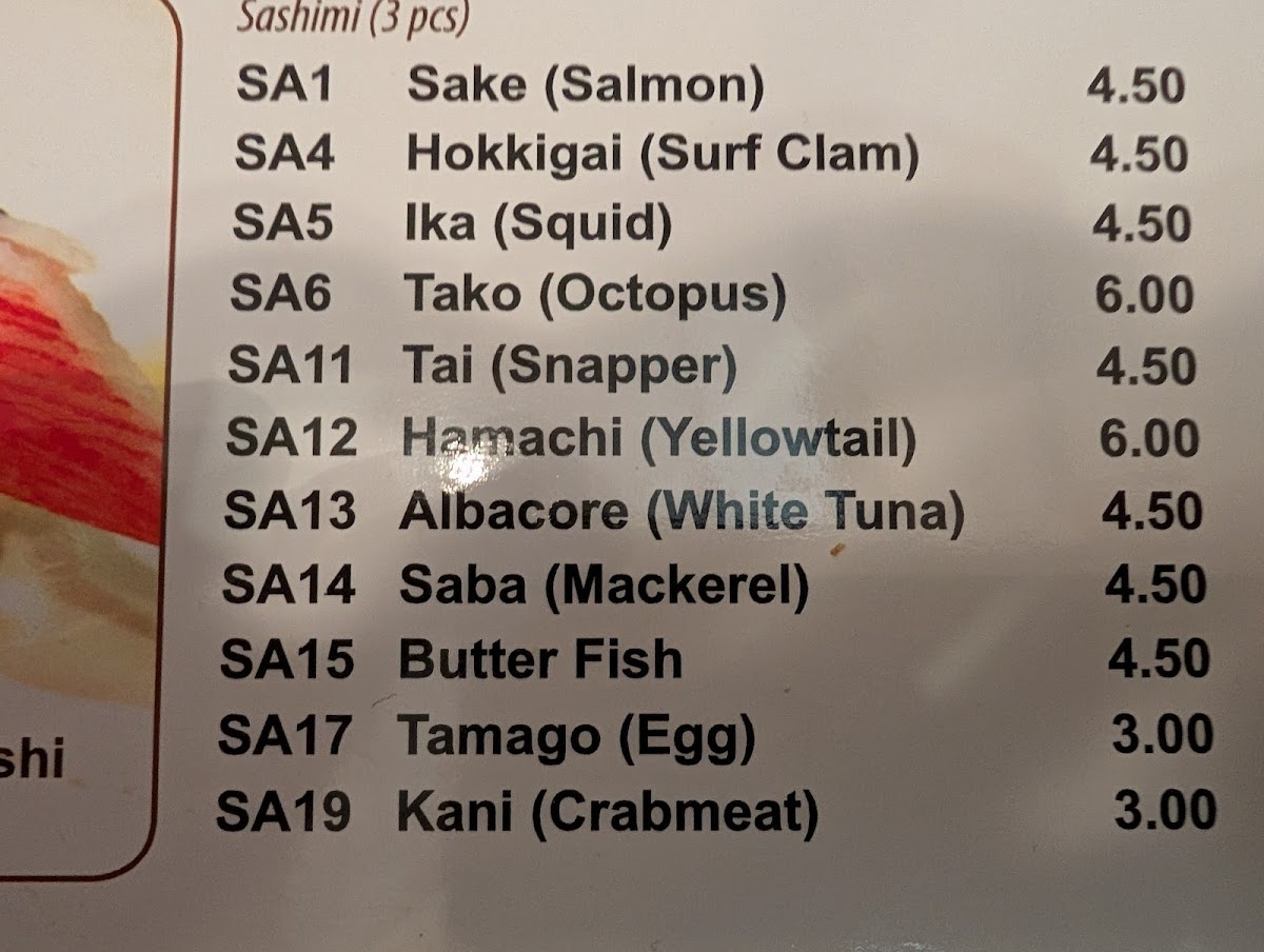 Sashimi: Various types of sashimi are available, including snapper, salmon, tuna, octopus, squid, shrimp, and crabmeat. Sashimi portions are typically three pieces each, providing an option for lighter seafood selections.